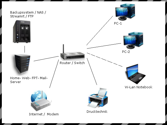 Ein Heimnetzwerk oder ein kleines Firmennetzwerk besteht aus mehr als nur einigen Geräten, die mit Kabeln verbunden sind. Im folgenden Bild können Sie ein Beispiel für ein gut strukturiertes Netzwerk sehen. Jedoch muss noch wesentlich mehr beachtet werden.